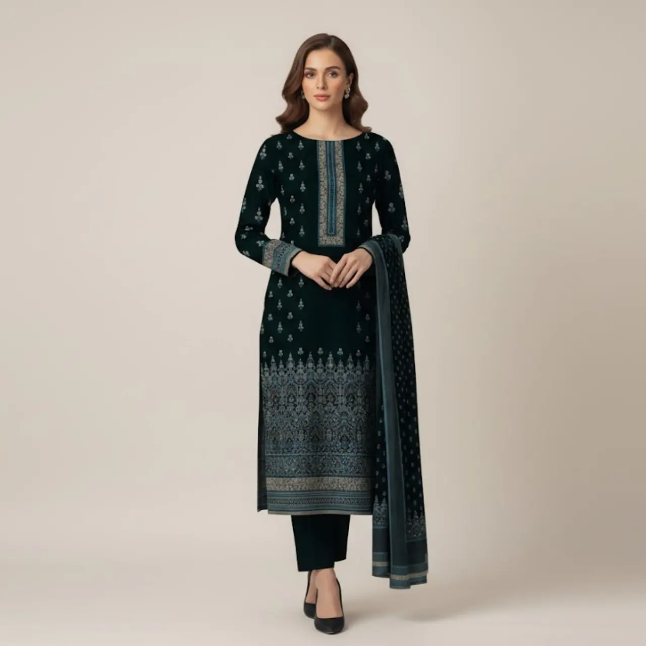 This elegant emerald printed lawn suit is designed with delicate motifs and a finely detailed border, paired with a matching dupatta and straight trousers for a timeless, sophisticated look.