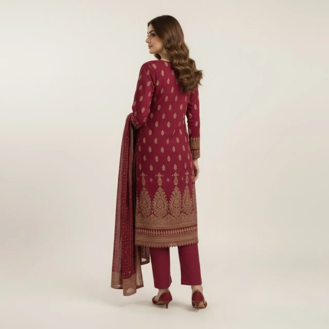 This maroon printed 3-piece lawn suit combines elegance with comfort, featuring a beautifully designed shirt adorned with delicate golden motifs and border detailing. The outfit comes with a matching trouser and a light, airy printed dupatta that completes the look with effortless charm. Crafted from premium-quality lawn fabric, it offers breathability and ease for everyday wear while maintaining a polished, stylish appearance — perfect for both casual and festive occasions.