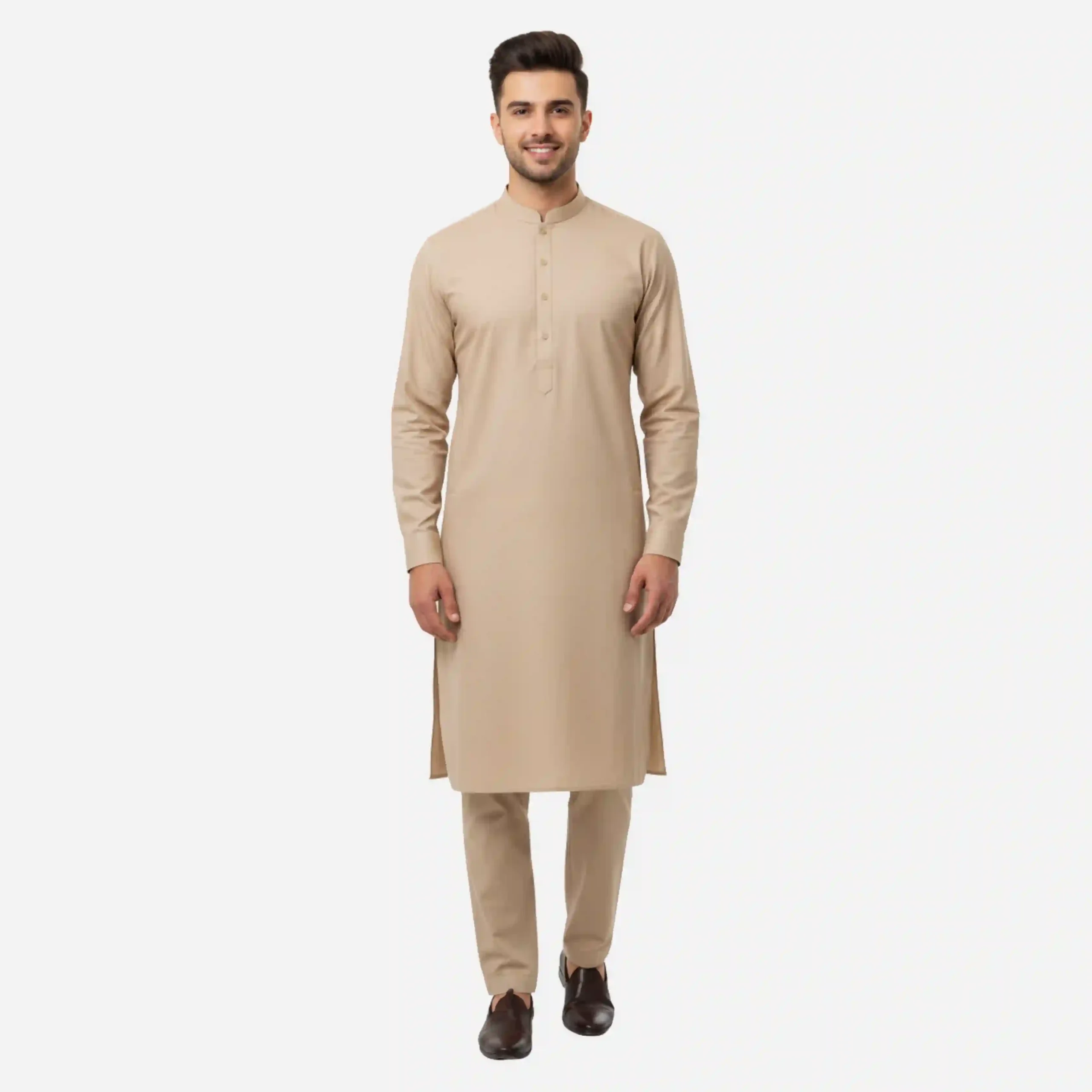 A stylish and sophisticated men’s traditional suit featuring a long, straight-cut kameez and matching shalwar in a versatile light beige/tan colour. It has a band collar and a simple button placket, perfect for both formal and casual occasions.