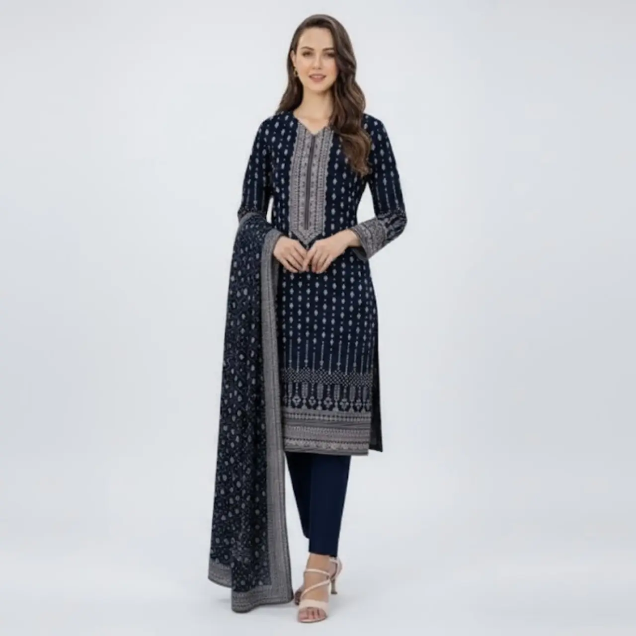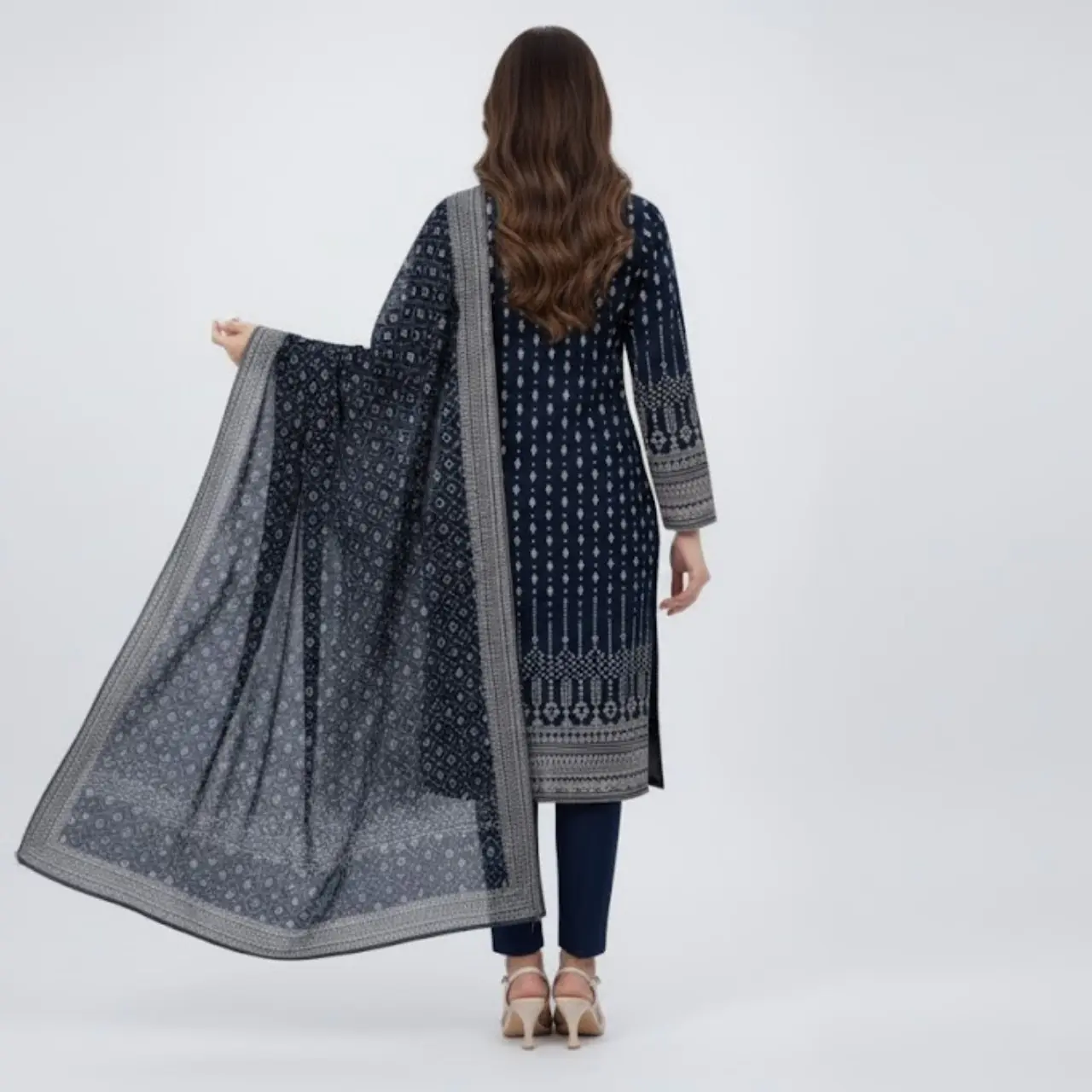 This navy blue 3-piece suit showcases delicate white printed patterns and elegant detailing for a refined, traditional look. Featuring a matching printed dupatta and plain trousers, it’s the perfect choice for semi-formal and everyday wear.