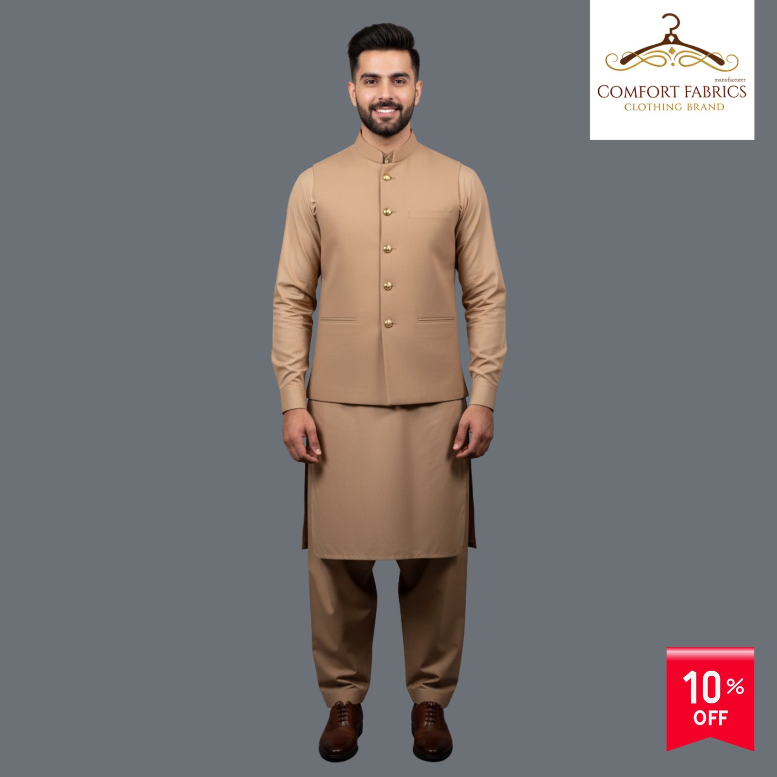 Premium Men’s Classic Beige Waistcoat Shalwar Kameez – Formal Eastern Wear by Comfort Fabrics